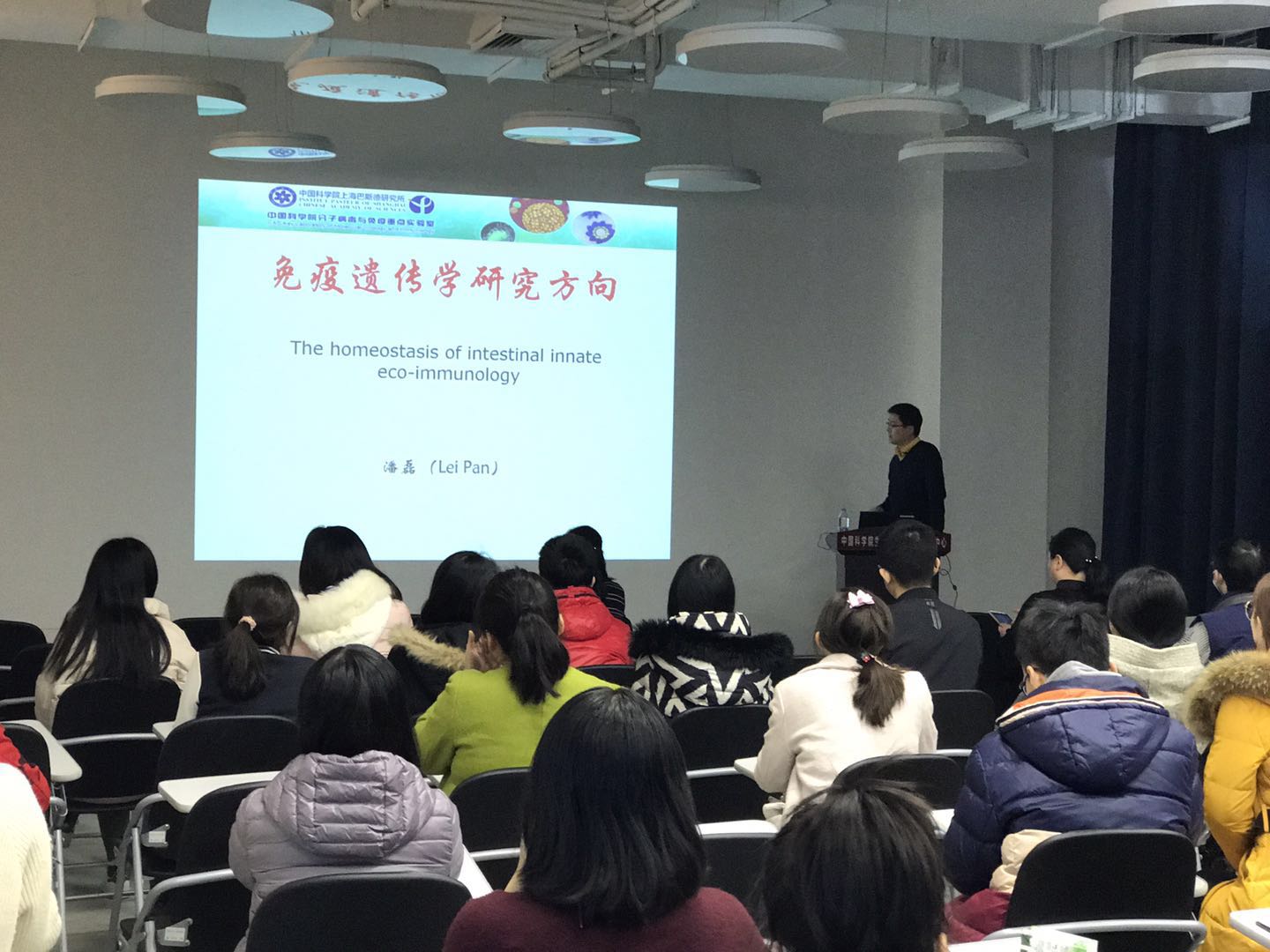 2018年1月10日,中科院上海上海生科院巴斯德所研究所潘磊研究员应刘南研究员的邀请,在中国科学院生物与化学交叉研究中心进行了题为“The homeostasis of intestinal innate eco-immunology ”的学术报告。潘磊研究员主要介绍了利用果蝇构建了成熟的病原菌感染模型,并利用大规模遗传筛选体系,寻找到Bap180因子具有调节肠道天然免疫平衡的新功能。Bap180应答肠道的IMD天然免疫通路,以负反馈方式在转录水平上限制IMD通路的过度活化,同时抑制由促炎因子Eiger介导的肠道炎性风暴和肠上皮组织损伤。小鼠肠上皮特异敲除进一步证实了Baf180在高等动物中具有同样的保守机制。此外,该研究还表明Bap180不仅针对病原菌急性感染所造成的炎性风暴有抑制作用,同时对于共生菌所触发的肠道慢性炎症的积累也具有重要的平衡作用。该研究中发现了一个重要的监控机体肠道天然免疫平衡的调节因子Bap180/Baf180,并解析了其可以作为关联天然免疫通路和炎性反应的关键节点,为今后肠炎诊断或是药物靶点的开发提供了重要的理论依据。