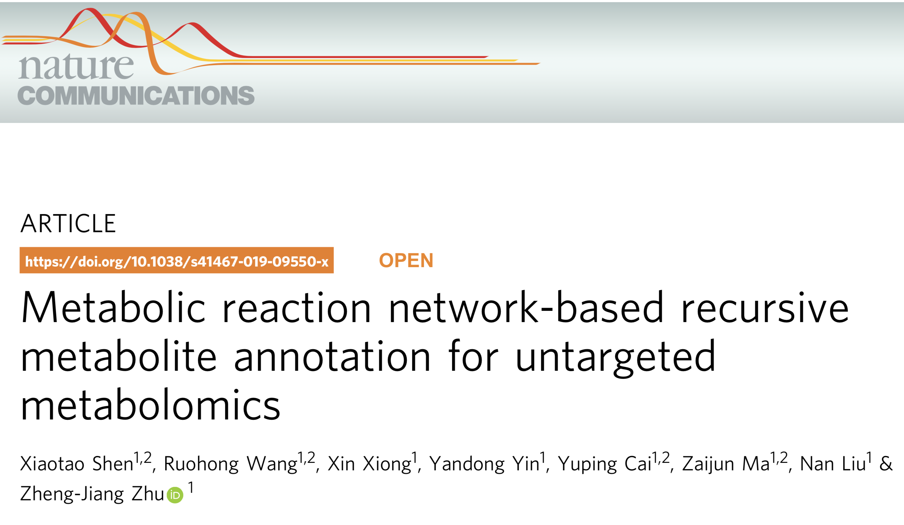 Large-scale metabolite annotation is a challenge in liquid chromatogram-mass spectrometry (LC-MS)-based untargeted metabolomics. Here, we develop a metabolic reaction network (MRN)-based recursive algorithm (MetDNA) that expands metabolite annotations without the need for a comprehensive standard spectral library. MetDNA is based on the rationale that seed metabolites and their reaction-paired neighbors tend to share structural similarities resulting in similar MS2 spectra. MetDNA characterizes initial seed metabolites using a small library of MS2 spectra, and utilizes their experimental MS2 spectra as surrogate spectra to annotate their reaction-paired neighbor metabolites, which subsequently serve as the basis for recursive analysis. Using different LC-MS platforms, data acquisition methods, and biological samples, we showcase the utility and versatility of MetDNA and demonstrate that about 2000 metabolites can cumulatively be annotated from one experiment. Our results demonstrate that MetDNA substantially expands metabolite annotation, enabling quantitative assessment of metabolic pathways and facilitating integrative multi-omics analysis.