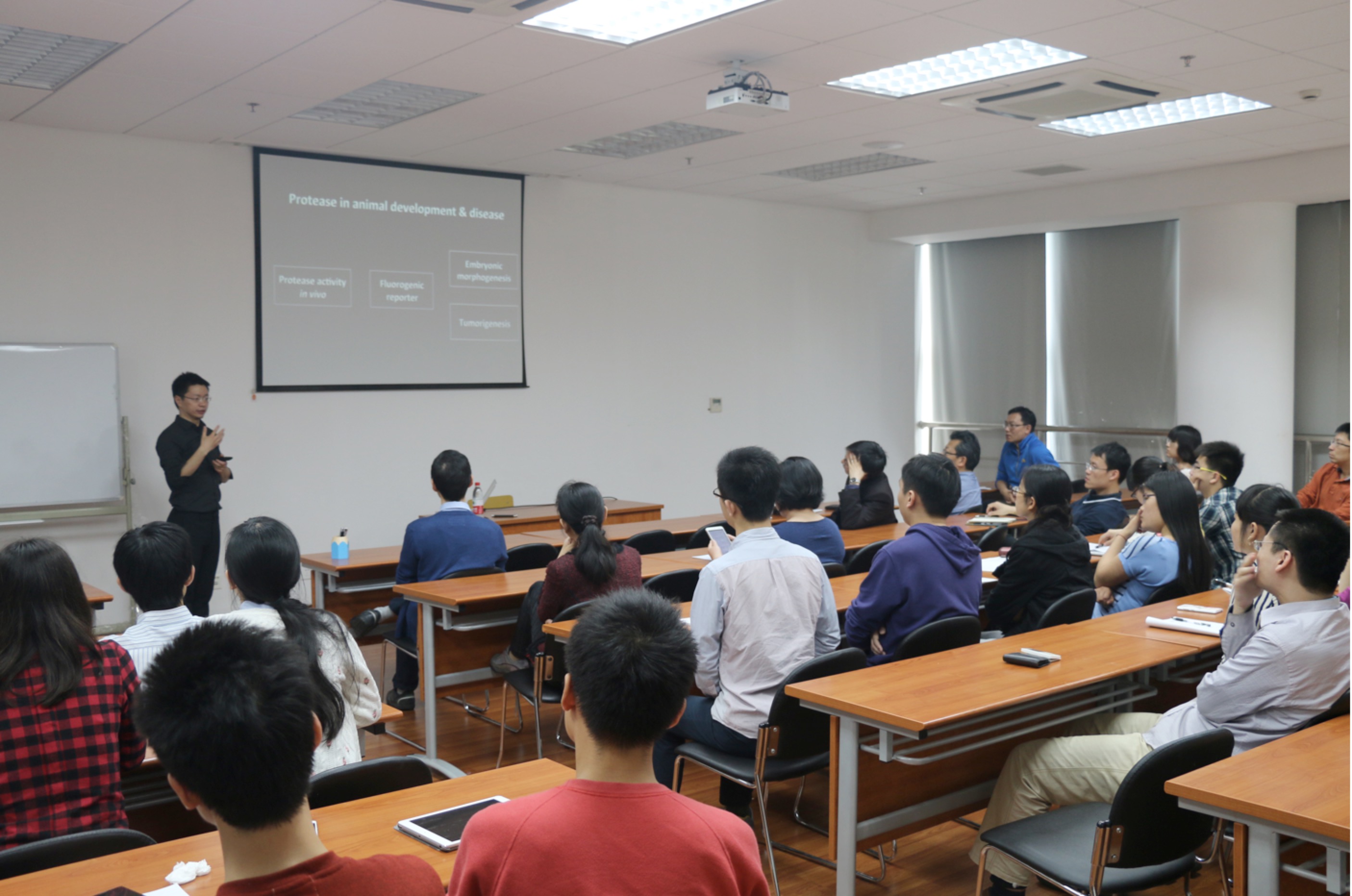 2015年5月4日,加尼福尼亚大学的舒校坤博士在中国科学院生物与化学交叉研究中心进行了题为“Arationally designed fluorogenic protease reporter visualizes spatiotemporal dynamics of apoptosis in vivo”的精彩学术报告。本次报告由刘南研究员主持。本次报告主要的内容是关于一种新的成像技术。基于荧光共振能量传递的reporters已经广泛用于细胞信号的成像。但是,由于在体内应用中信号较弱,导致了一定的缺陷。荧光reporters解决了这个问题,目前还没有这类的蛋白酶被证明可以在体内成像。现在他们重新设计了一个红外荧光蛋白,蛋白酶的活性可以调节发色团的掺入。基于蛋白酶的活化,红外荧光蛋白酶reporter在没有外源性辅助因子的情况下也可以发光。为了证实这一生物学的应用,他们设计了一个infrared fluorogenic executioner-caspase reporter,它在细胞凋亡和胚胎形态中起着时空调节的的作用,同时也在果蝇肿瘤发生过程中的凋亡动力学中起着相同的作用。这种设计的支架将会应用于其他蛋白酶类的engineer reporters中,但是必须具有特异性切割序列。他们目前的工作展示了一个新的方法,主要是通过处理特异性的蛋白与发色团之间的相互作用而达到。报告结束后,师生们踊跃提出自己的疑问与见解,舒博士为大家一一作答,并进行了进一步的探讨和交流。最后在大家的掌声中报告圆满结束。