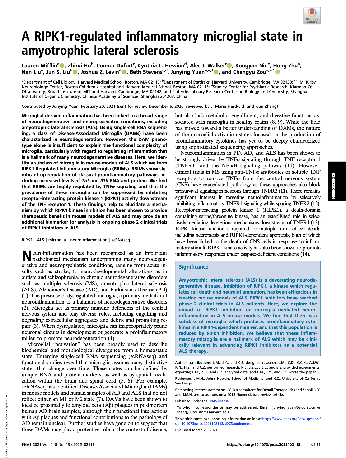 PNAS paper Published:A RIPK1-regulated inflammatory microglial state in amyotrophic lateral sclerosis