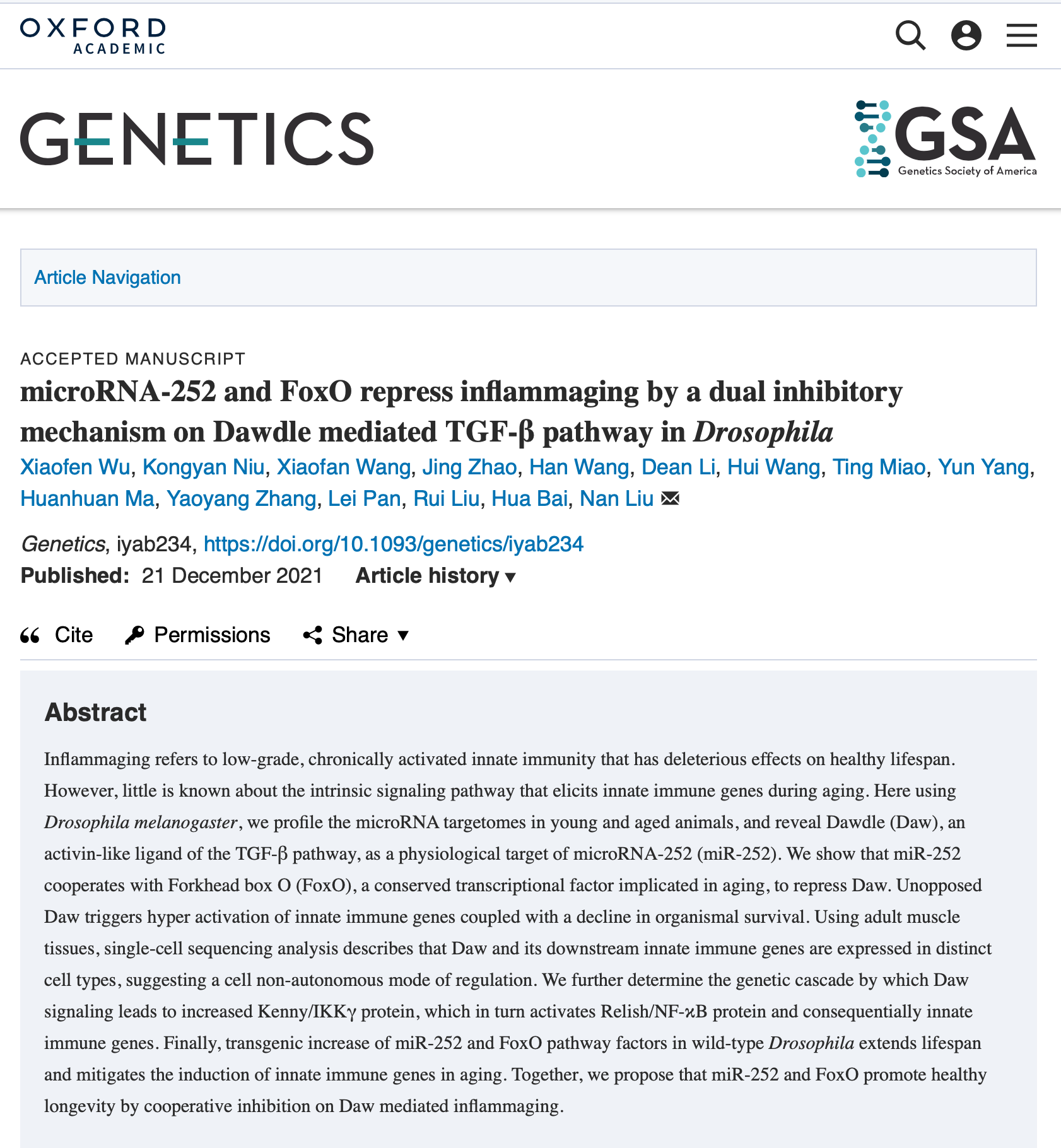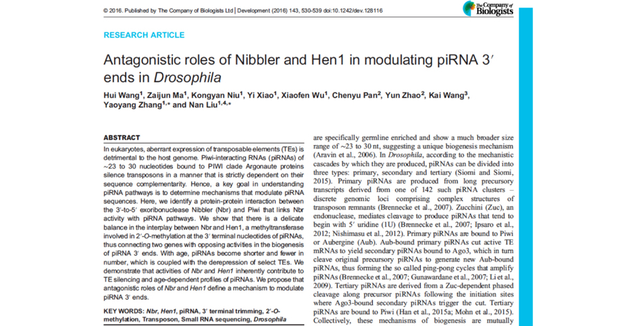 经过中国科学院生物与化学交叉中心全体PI遴选,中心内部公示以及中国科学院大学公示,交叉中心博士研究生王辉同学荣获2016年度国家奖学金。研究生国家奖学金用于奖励表现优异的全日制研究生,自2012年起,每年评选一次。王辉同学是2012级研究生,并于2013年进入刘南老师课题组攻读博士学位。在学习课程上,所有课程均通过且成绩优异。在科研工作上,充分思考,积极探索。目前,分别以第一作者在Development (IF: 6.059) 和第三作者在Cell Reports (IF: 7.87) 发表研究型论文。其中第一作者文章“Antagonistic roles between Nibbler and Hen1 modulate piRNA 3’ ends in Drosophila” 揭示了果蝇中Nbr和Hen1蛋白对piRNA 3’ 端的拮抗调节机制,证实这种长度调节与piRNA的功能具有相关性,并首次报道piRNA在衰老过程中被有序调控。在进一步的研究工作中,王辉同学揭示了表观遗传与衰老的调节机制,整合表观组,转录组,蛋白组及代谢组多维数据,相关工作正在整理,预期投稿到顶尖学术期刊。交叉中心在国家奖学金的评选中,坚持以学术成果为导向,公开,透明。交叉中心鼓励研究生积极攻坚克难,追求卓越,发表更多高水平的,突破性的成果。