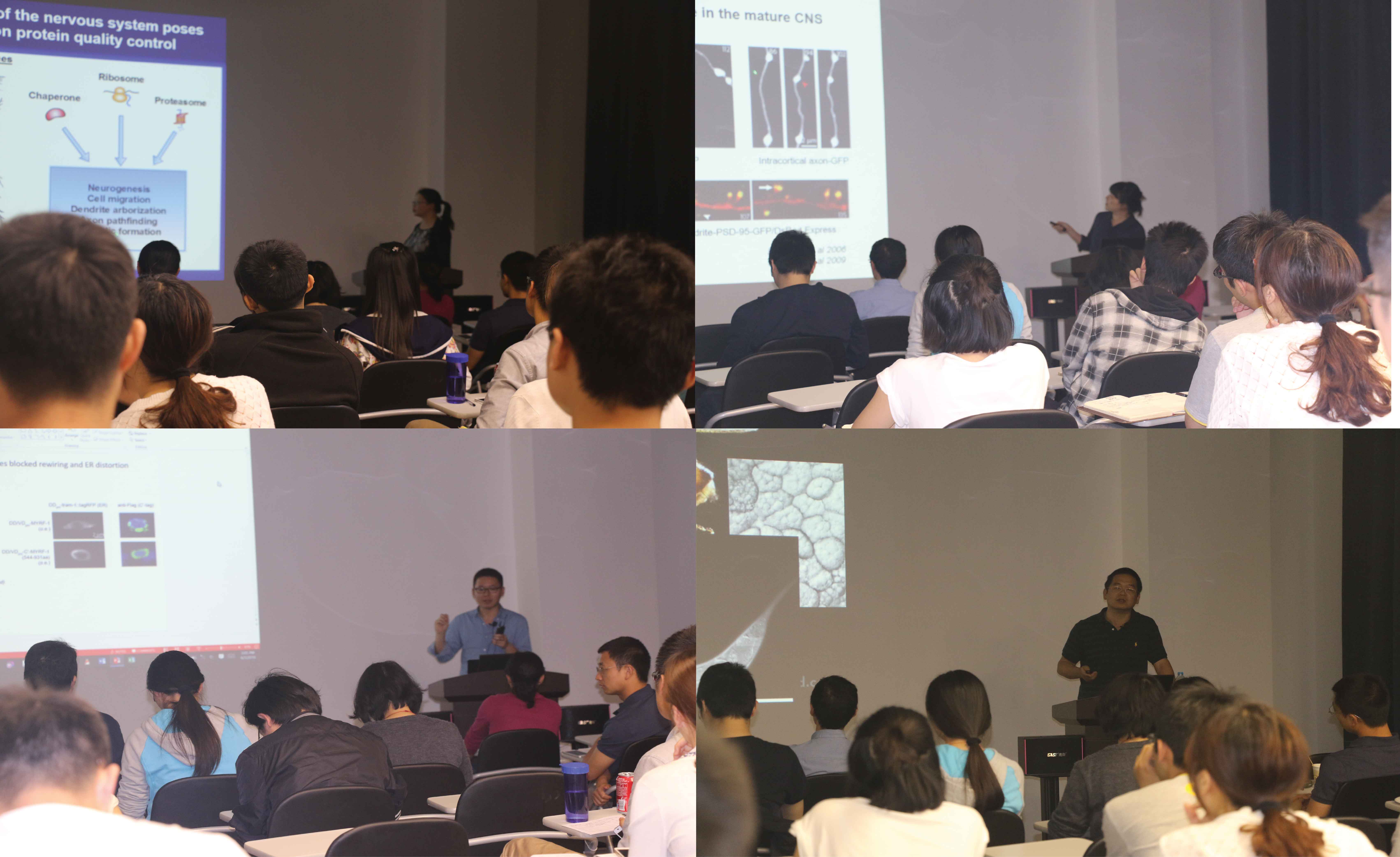 2016年6月3日,我们迎来了四位专家到访并做学术报告,分别是:王志萍教授(浙江大学,报告题目:Protein quality control and the health of neurons); 齐瀛川教授(杭州师范大学,报告题目:Cleavable ER-bound transcription factors Myrf-1 and Myrf-2 cooperatively controls the synaptic rewiring in C. elegans);丁梅研究员(中科院遗传与发育研究所,报告题目:Synaptic maintenance and function in C. elegans);黄勋研究员(中科院遗传与发育研究所,报告题目:Lipid storage: from organelle to tissues)。报告会的内容涉及到神经生物学和细胞生物学相关领域,从分子水平的蛋白稳态调控,脂类代谢调控,到细胞水平的神经突触形成及可塑性。